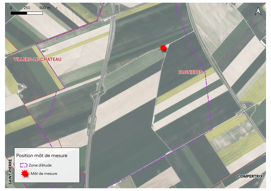 Le mât a été positionné sur la zone d'étude à proximité des boisements, à un endroit stratégique afin de réaliser les mesures les plus représentatives de l'activités des chiroptères.